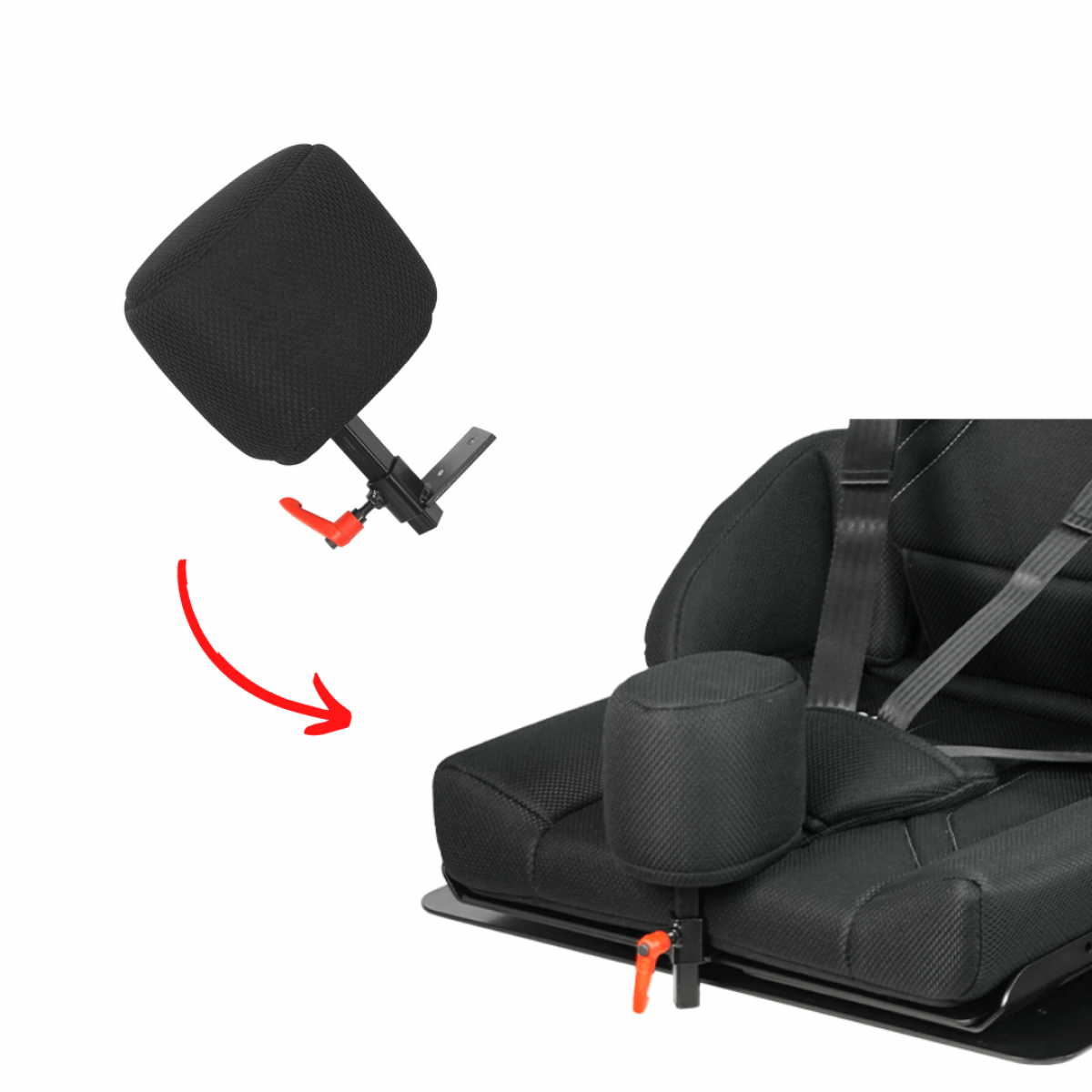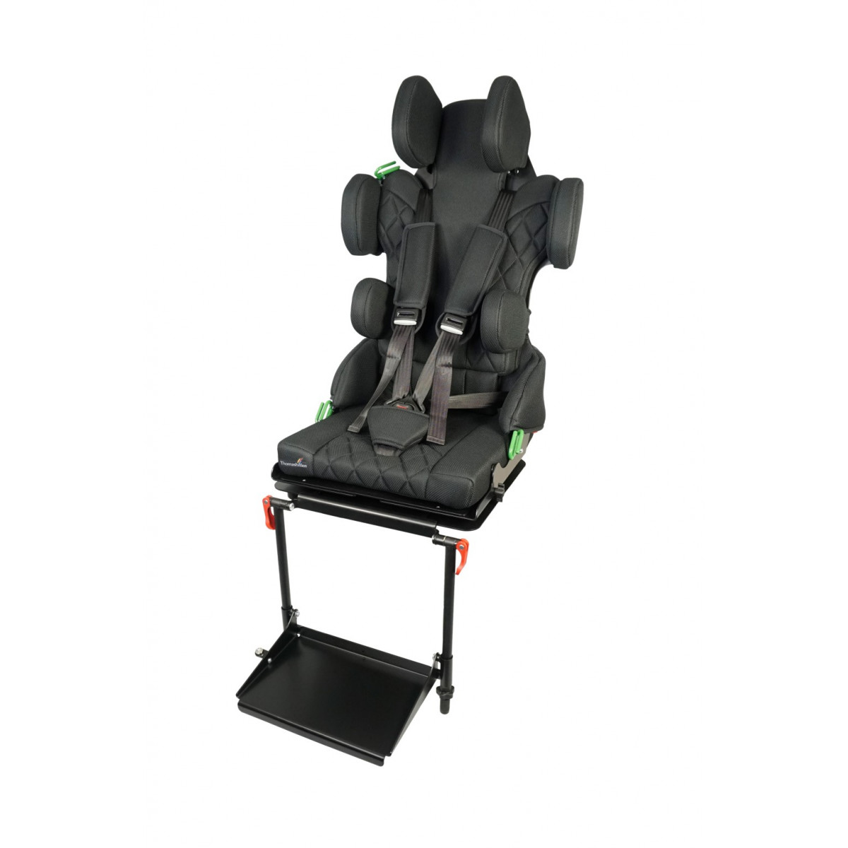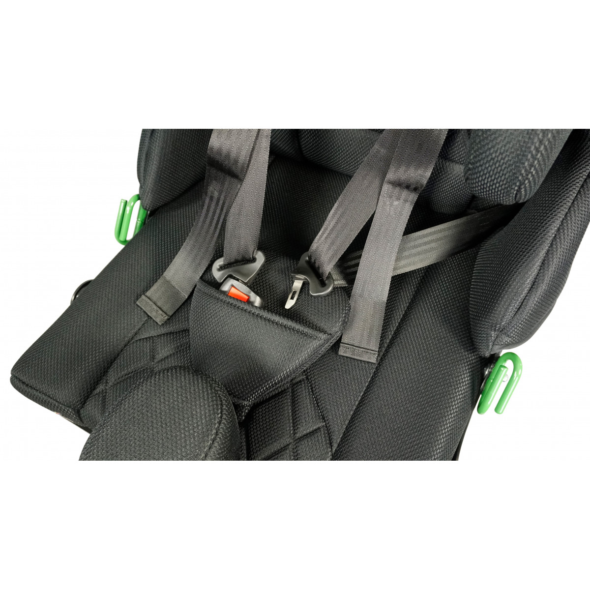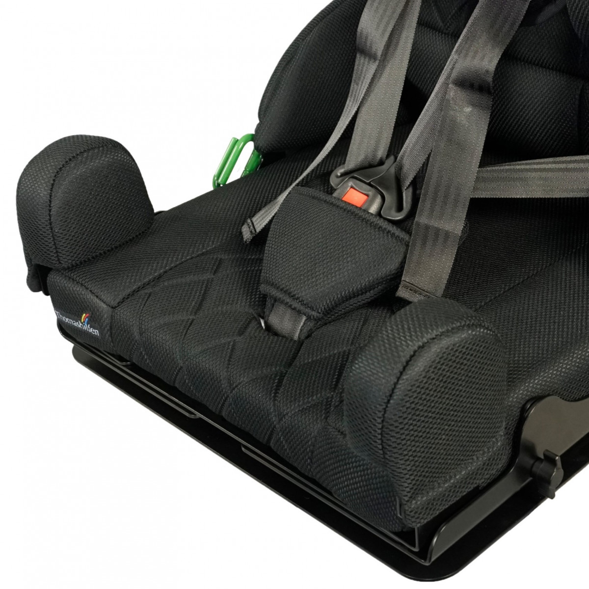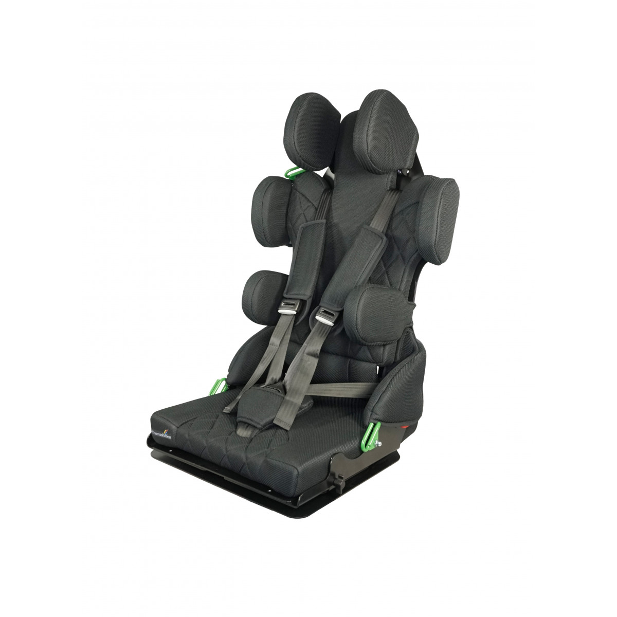 Для правильной поддержки предусмотрены плавная регулировка высоты спинки, анатомичный подголовник и опоры для бёдер. Важной особенностью модели являются плечевые поддержки, которые стабилизируют положение ребёнка и предотвращают излишние наклоны во время движения. Дополнительно могут устанавливаться боковые поддержки с откидным механизмом, усиливающие фиксацию туловища.