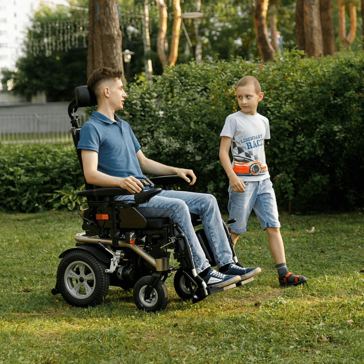 Передние колёса коляски имеют увеличенный диаметр, что способствует лучшей маневренности и управляемости. Это также положительно сказывается на комфорте движения, позволяя более плавно проходить через неровности и препятствия на дороге. Задние колёса, обладающие внедорожным протектором, гарантируют прекрасное сцепление с различными поверхностями, в том числе с травой, гравием и песком.
