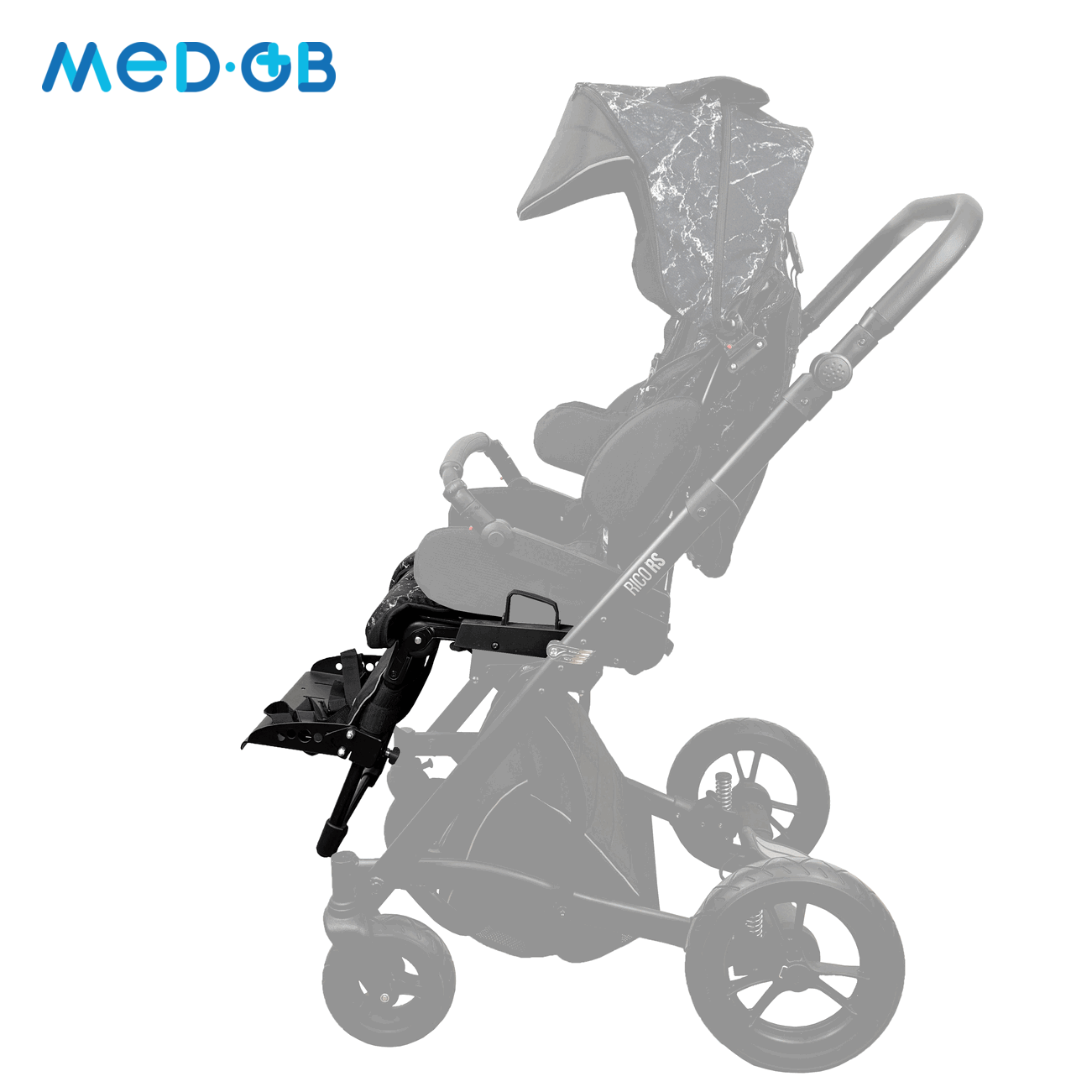 В Rico Buggy сиденье съёмное и может устанавливаться как в направлении движения, так и против. Оно может изменяться в ширине и глубине, что позволяет обеспечить поддержку бёдер по всей длине, даже если у ребенка есть разница в длине ног до 10 см. Это делает коляску уникальной и адаптируемой под различные потребности и анатомические особенности ребёнка. Система поддержки поясницы позволяет регулировать форму спинки сиденья, что особенно полезно при искривлениях поясничного отдела позвоночника. Коляска оснащена двумя съёмными боковыми упорами и мягким подголовником, которые обеспечивают необходимую поддержку головы. Спинка с поясничной опорой может регулироваться по высоте и углу наклона, что позволяет адаптировать коляску под рост и потребности ребёнка. Подножка регулируется в диапазоне от 0° до 90° по углу наклона и по высоте, обеспечивая правильное положение ног. Угол наклона платформы для стоп также регулируется от -20° до +20°. Эта функция позволяет сохранить правильный угол между бедром и голенью в 90°.