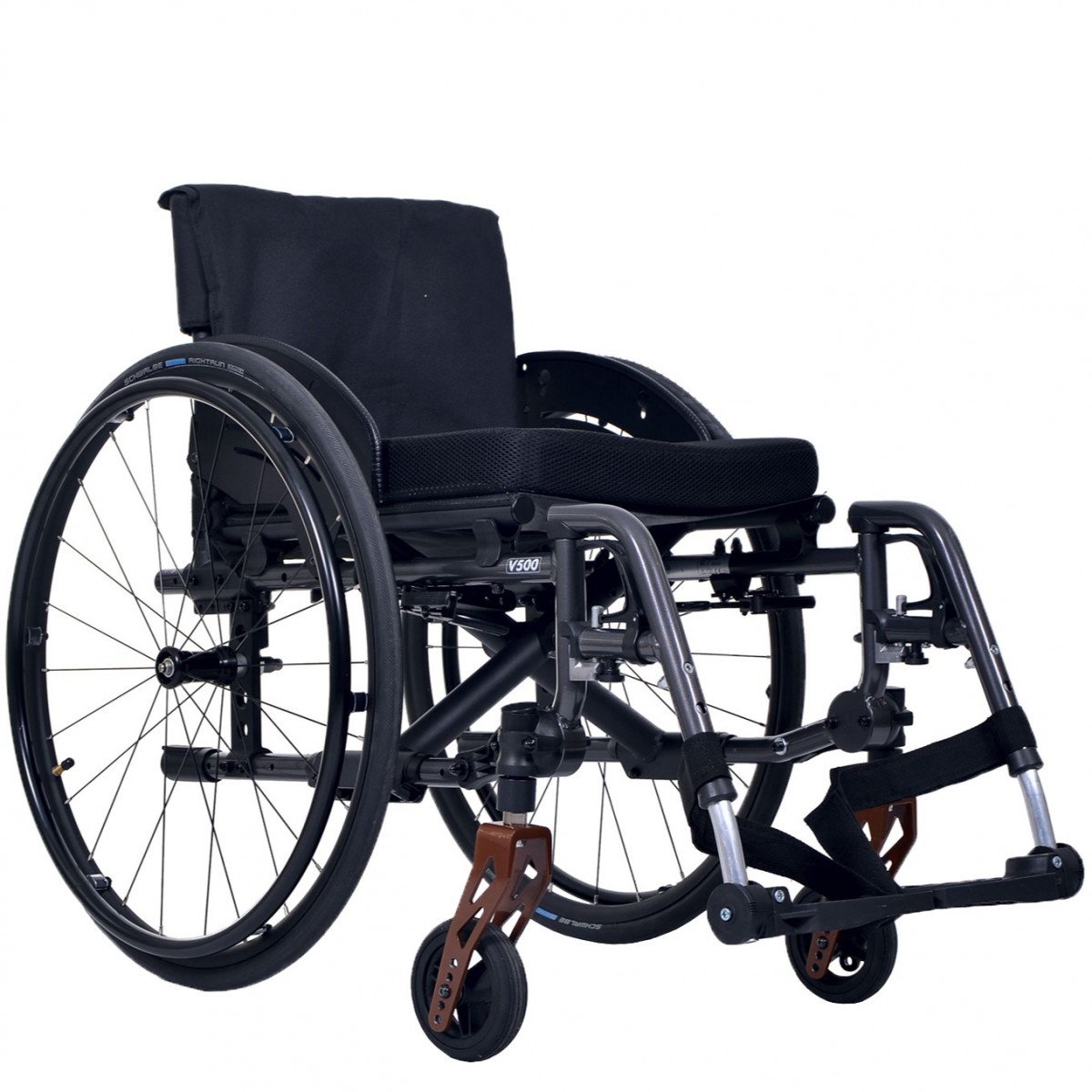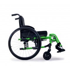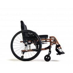 Вместо классических подлокотников активная инвалидная коляска оснащена защитными щитками. Особенностью данной модели является возможность настраивать натяжение спинки и сидения с использованием специальных ремней. Спинку можно регулировать по вертикали, а сидение – по глубине и высоте. Подножки имеют возможность снятия, а также могут быть отрегулированы по высоте или отведены в сторону.