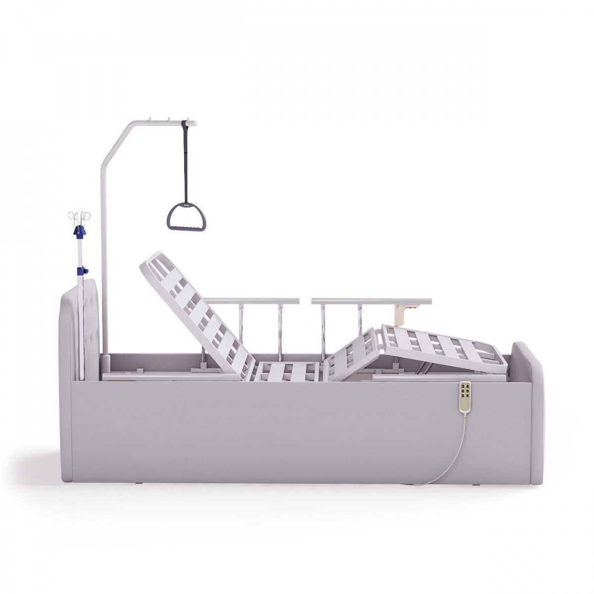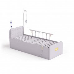 Кровать оснащена системой регулировки: с помощью проводного пульта дистанционного управления вы можете легко изменять положение изголовья и изножья, приспосабливая кровать к индивидуальным потребностям пользователя. Боковые ограждения, изготовленные из прочного алюминия, можно быстро опустить для удобства доступа.