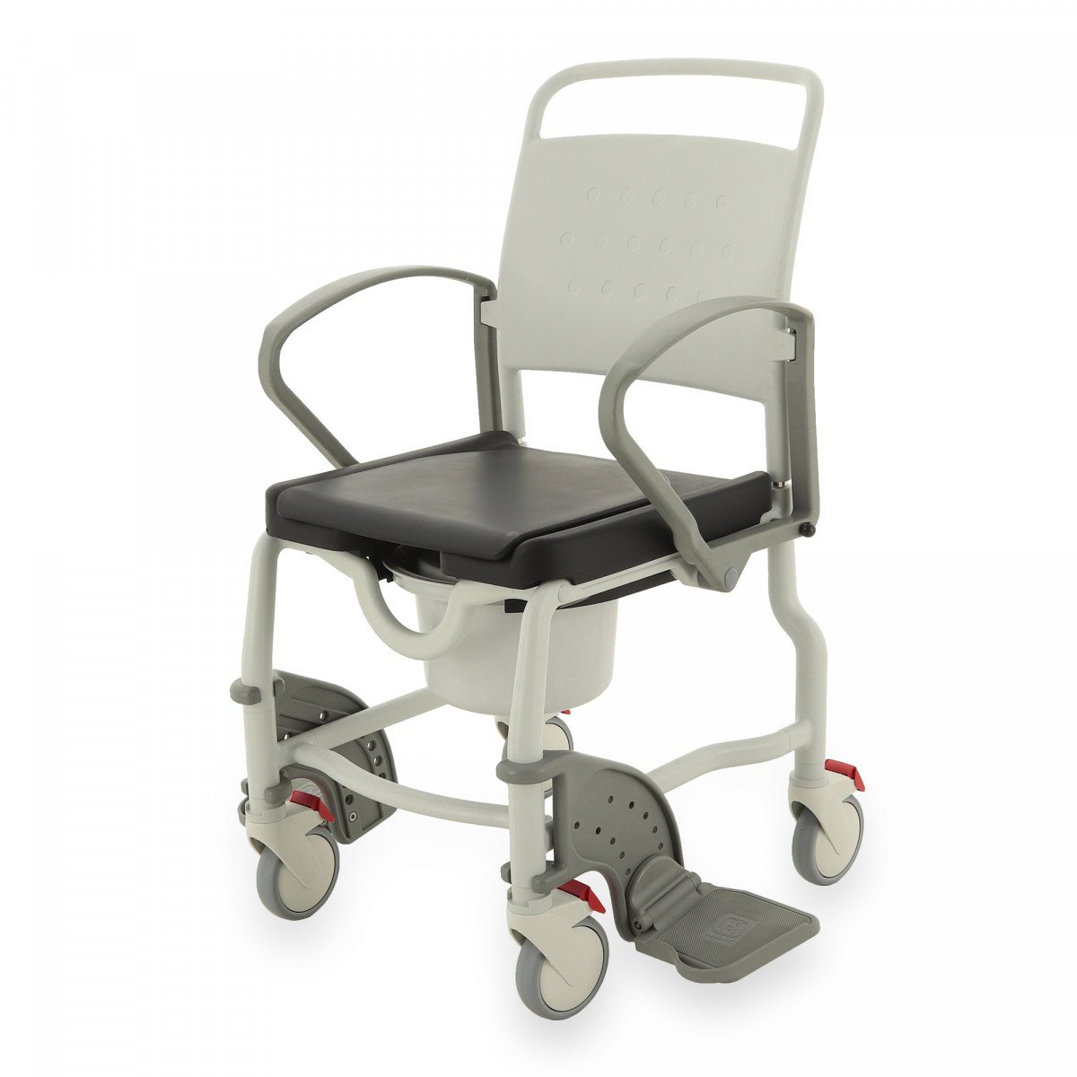 Rebotec Берлин оснащён четырьмя колёсами, задние — со стояночными тормозами. Есть мягкое сиденье с гигиеническим вырезом и крышкой из полиуретана, а также система для стекания воды. Откидные подлокотники фиксируются в нужном положении, а подножки регулируются по высоте и при необходимости легко снимаются.