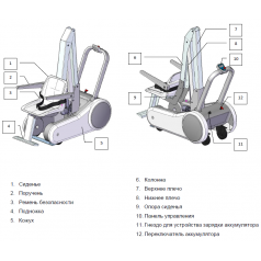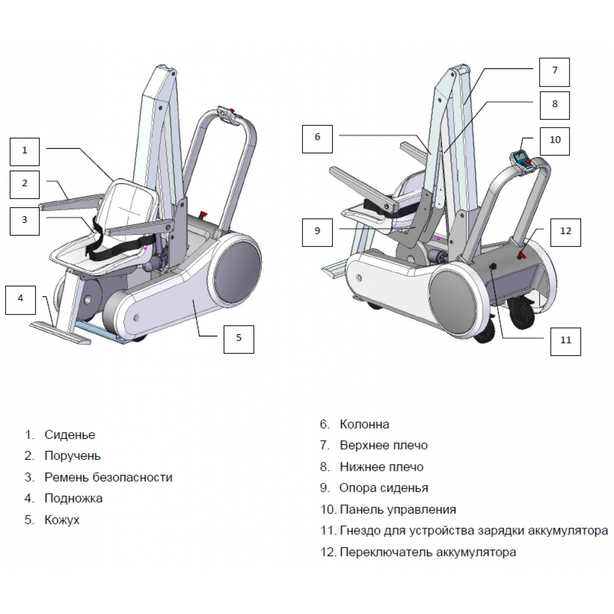 Подъёмник оснащён регулируемым сиденьем для комфортной посадки и панелью управления с кнопками подъёма, опускания и аварийной остановки. Перезаряжаемой батареи хватает примерно на 50 рабочих циклов, что обеспечивает автономность и удобство в повседневном использовании.