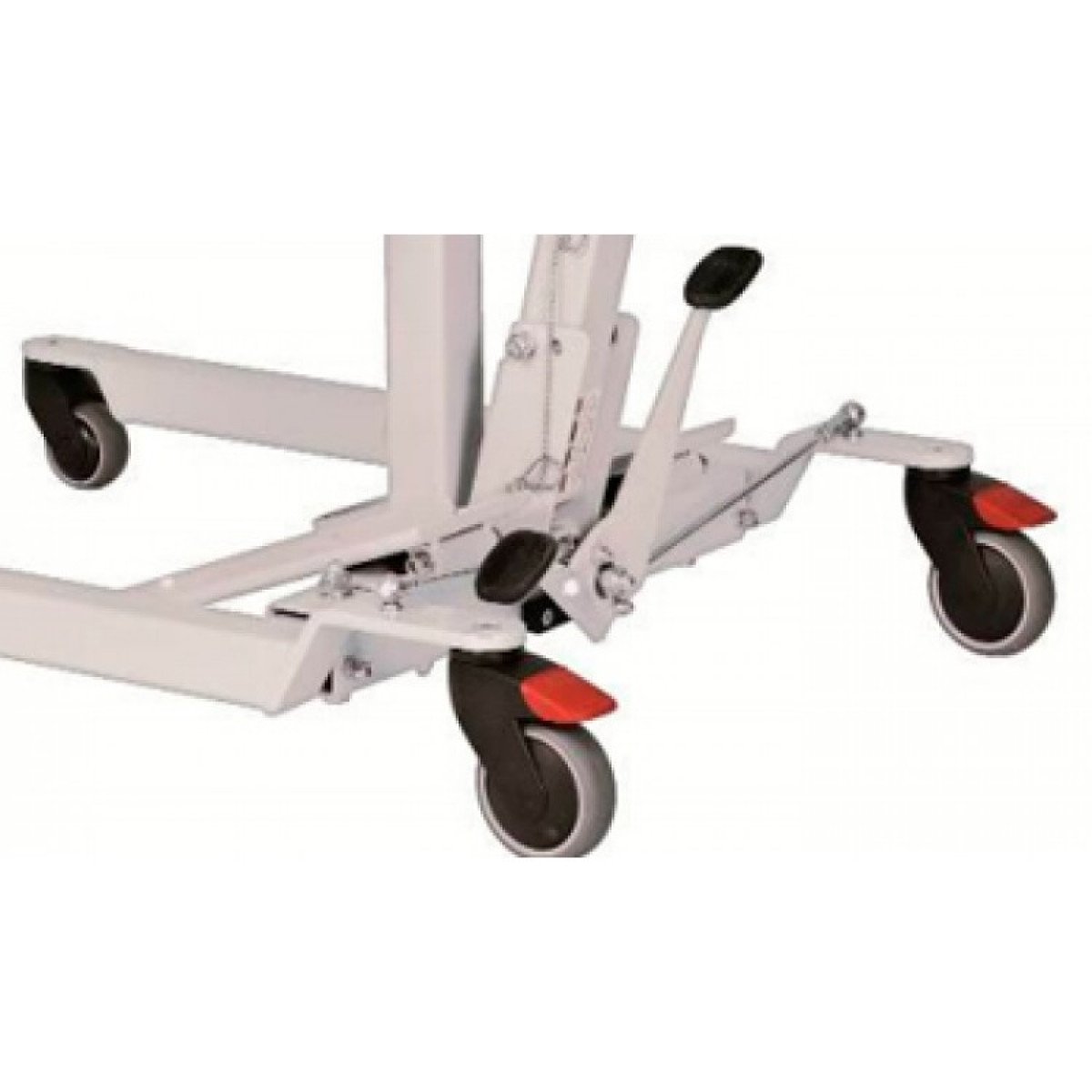 Модель оснащена ручным пультом управления, с помощью которого регулируется плавное поднятие и опускание кронштейна. Для повышения устойчивости шасси может быть расширено с помощью ножной педали. Для индивидуального подбора положения пациента доступны различные варианты ремней и перевязей.
