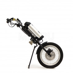 - Быстросъёмное крепление к переду механического кресла-коляски позволяет снимать мото-колесо с конструкции не сходя с кресла