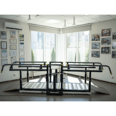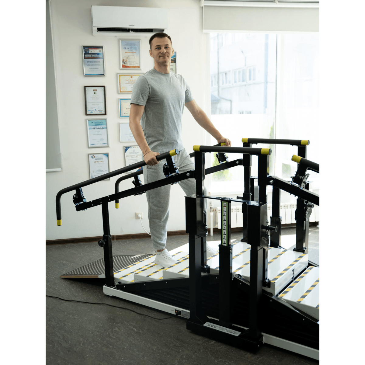 - Лестница. Тренажёр включает лестницу с четырьмя ступенями, имеющими противоскользящее покрытие, что обеспечивает безопасность во время занятий. Каждая ступень легко адаптируется к индивидуальным потребностям пациентов, позволяя им проходить этапы реабилитации с учётом их возможностей.