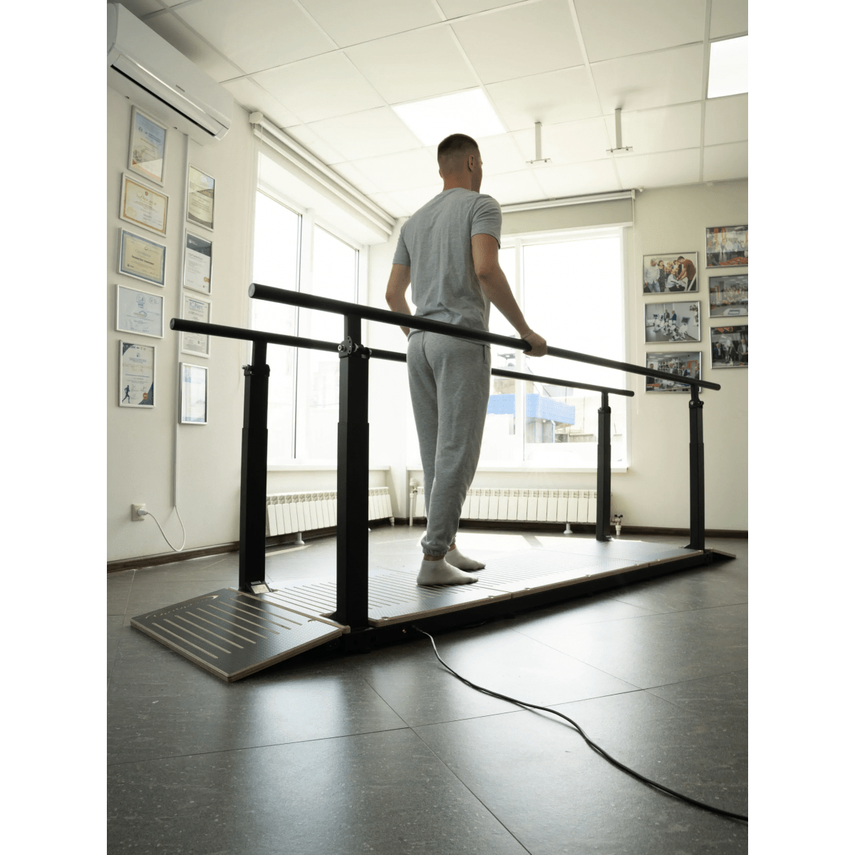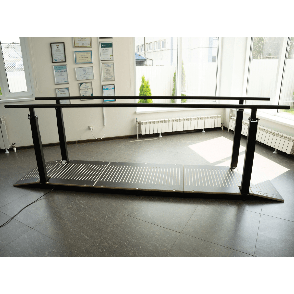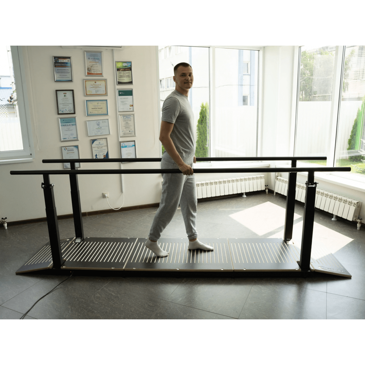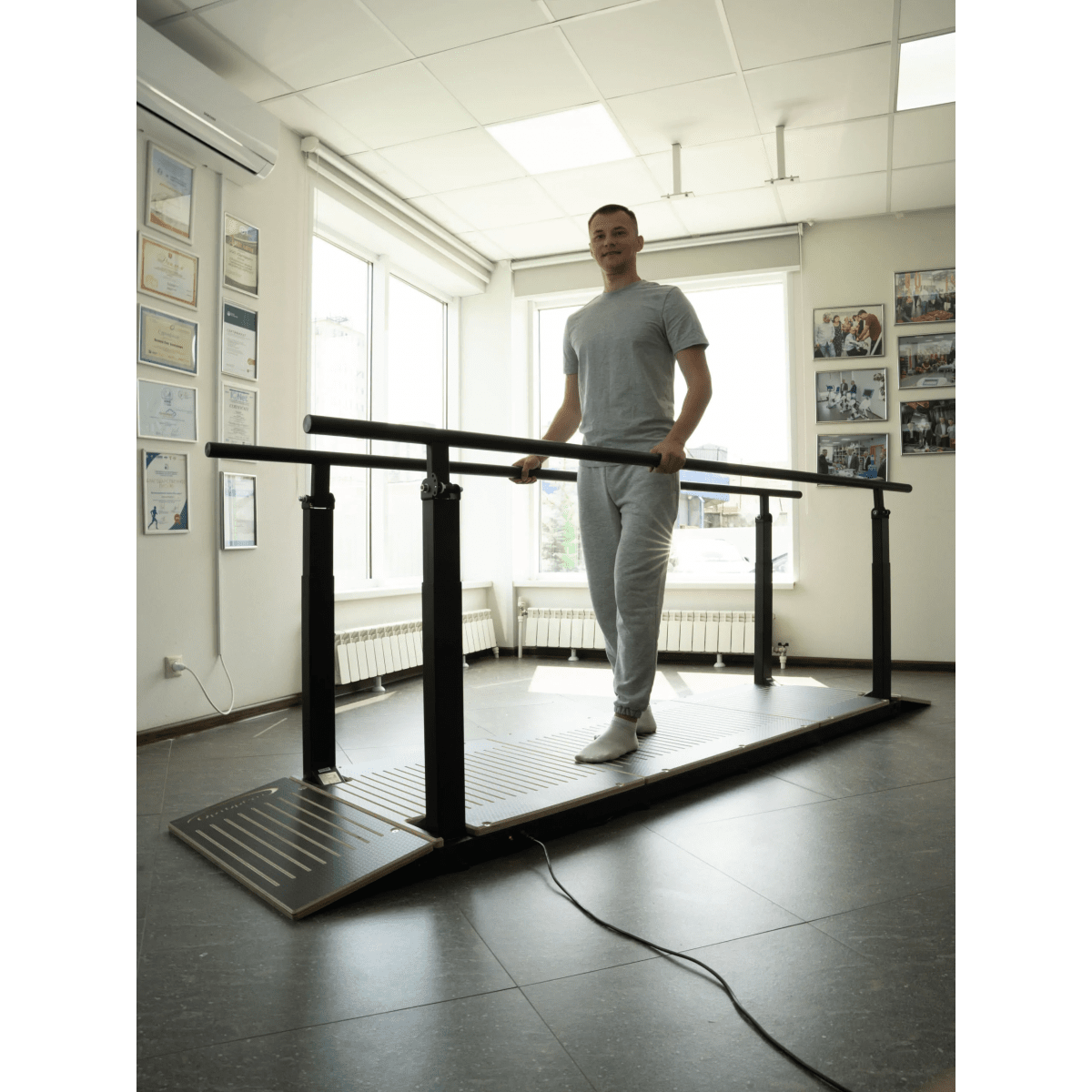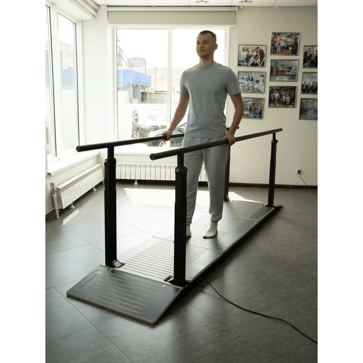 Одним из ключевых преимуществ тренажера Carmina является его способность обеспечивать безопасность маломобильных пациентов при совершении первых шагов. Во время движения и в перерывах на отдых пациенты могут опираться на специально установленные поручни, которые обеспечивают надёжную поддержку и помогают снять нагрузку с ослабленных нижних конечностей. Параллельные брусья, встроенные в систему тренажера, предназначены для выполнения множества разнообразных комплексов упражнений, которые могут быть адаптированы в зависимости от состояния здоровья и физических возможностей пациента. Все модификации тренажёра обладают механизмом регулировки высоты и ширины поручней, что позволяет индивидуально подстраивать оборудование под параметры каждого человека. Кроме того, тренажер оборудован пандусом с обеих сторон, что делает его доступным для пациентов, передвигающихся на инвалидных колясках.
